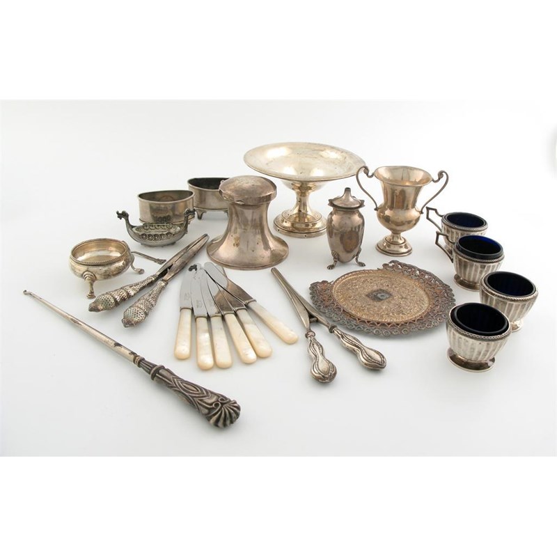 comprising: a tazza of circular form, Birmingham 1912, a money box, (locked), a George III salt cellar, a pair of salt cellars, three further salt cellars and a mustard pot, a salt pot, a small trophy cup, a Norwegian long boat salt cellar and other items, approx. weighable 10oz. (qty)