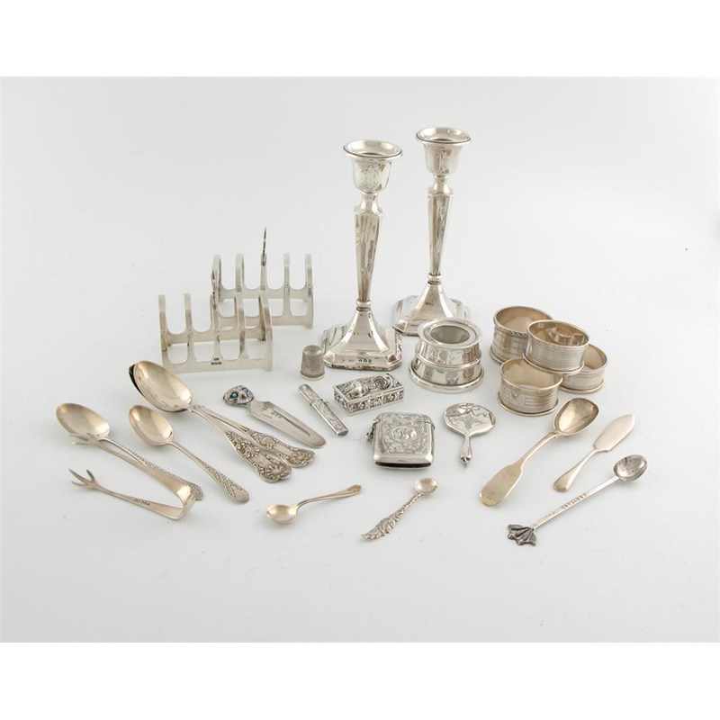 various dates and makers,comprising: a Victorian book mark with an owl head finial, by S. Mordan, London 1895, a matched pair of toast racks, a pair of candlesticks, a vesta case, four napkin rings, a miniature mirror, a thimble, four teaspoons, a mustard spoon, a butter knife, a pair of tongs, a pill box, an inkwell and other items, approx. weighable 11oz. (qty)