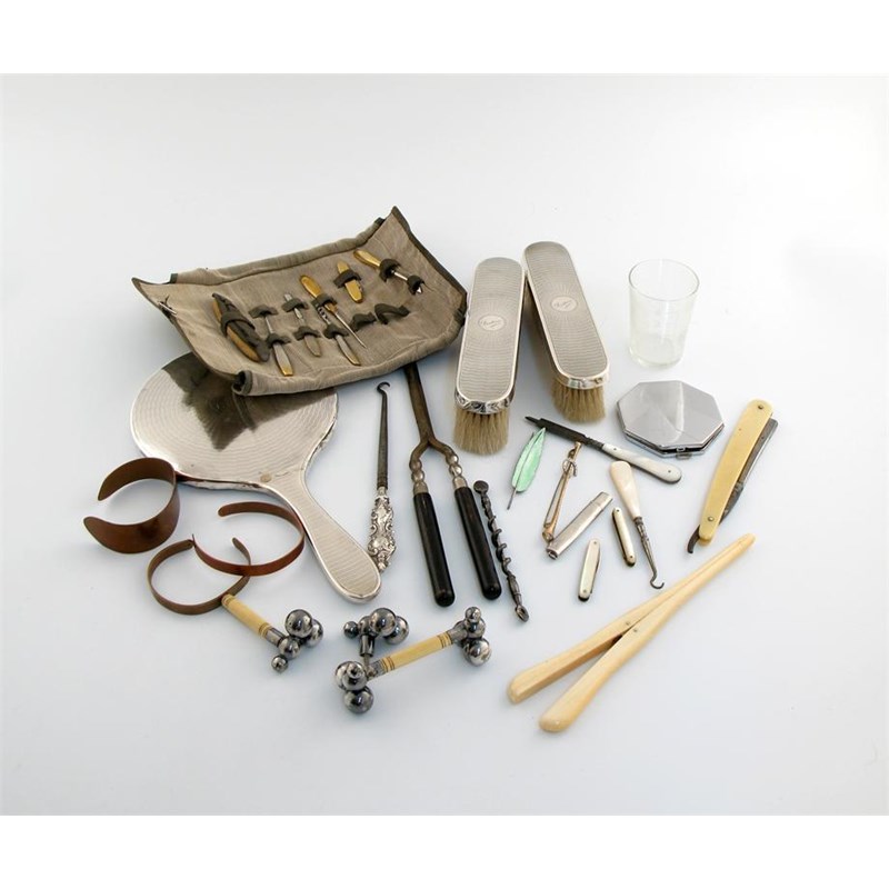 comprising: a 19th century steel peg and worm corkscrew, a silver mirror and two clothes brushes, a pair of electroplated knife rests and other items. (qty)