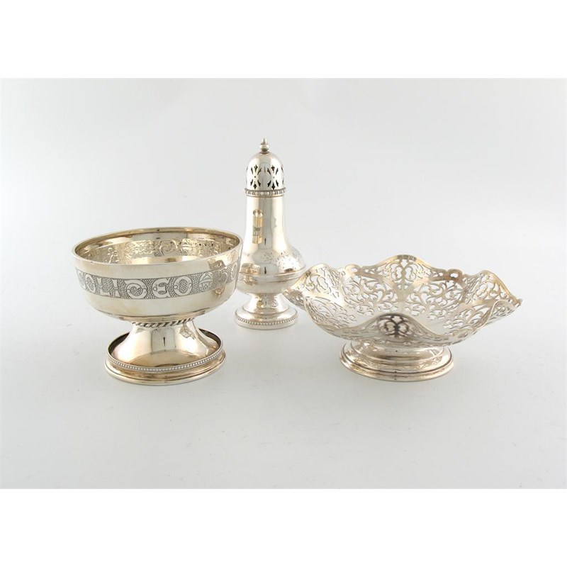 circular form, the body with a chased inscription, on a circular foot, plus a pierced silver dish and an electroplated sugar caster, approx. weight 16oz. (3)