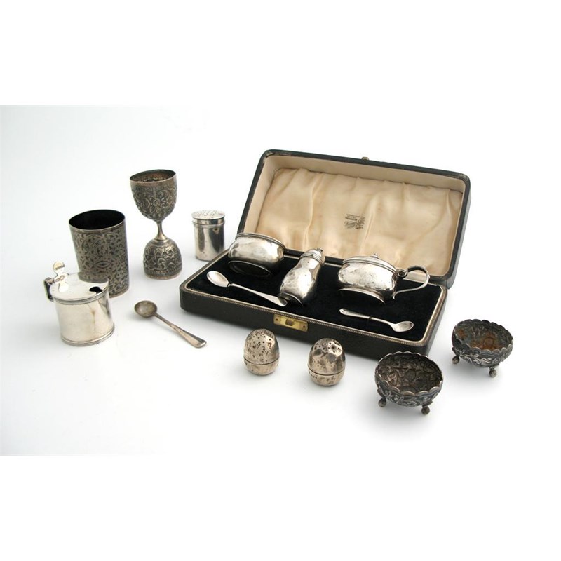 comprising: a Russian beaker of tapering circular form, with foliate scroll niello decoration, a cased three-piece condiment set with two spoons, a mustard pot, three pepper pots, an Indian double measure and a pair of Indian salt cellars, approx. weighable 10oz. (qty)