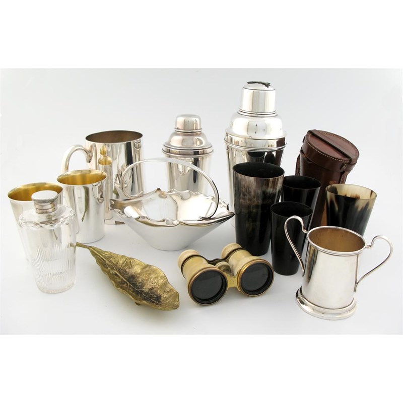 comprising; a travelling spirit flask and two beakers, plus two cocktail shakers, a mug, a Hukin and Heath bowl, a two handled pot, plus a set of horn beakers, and a brass dish. (qty)