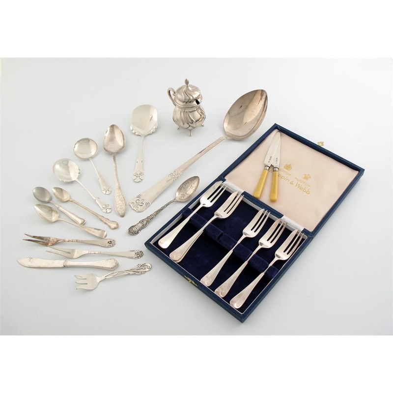 comprising: Danish silver items, a mustard pot of fluted baluster form, scroll handle, plus two silver knives, eight items of Scandinavian flatware, and American spoon, plus a large electroplated spoon a cased set of six electroplated cake forks and three other items. (qty)