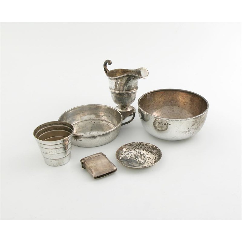 comprising: a two handled dish, by A. E. Jones, Birmingham 1927, circular form, spot-hammered decoration, plus a cream jug, a sugar bowl, a pin dish, a vesta case, and an American silver beaker by Tiffany, approx. weight 12oz. (7)