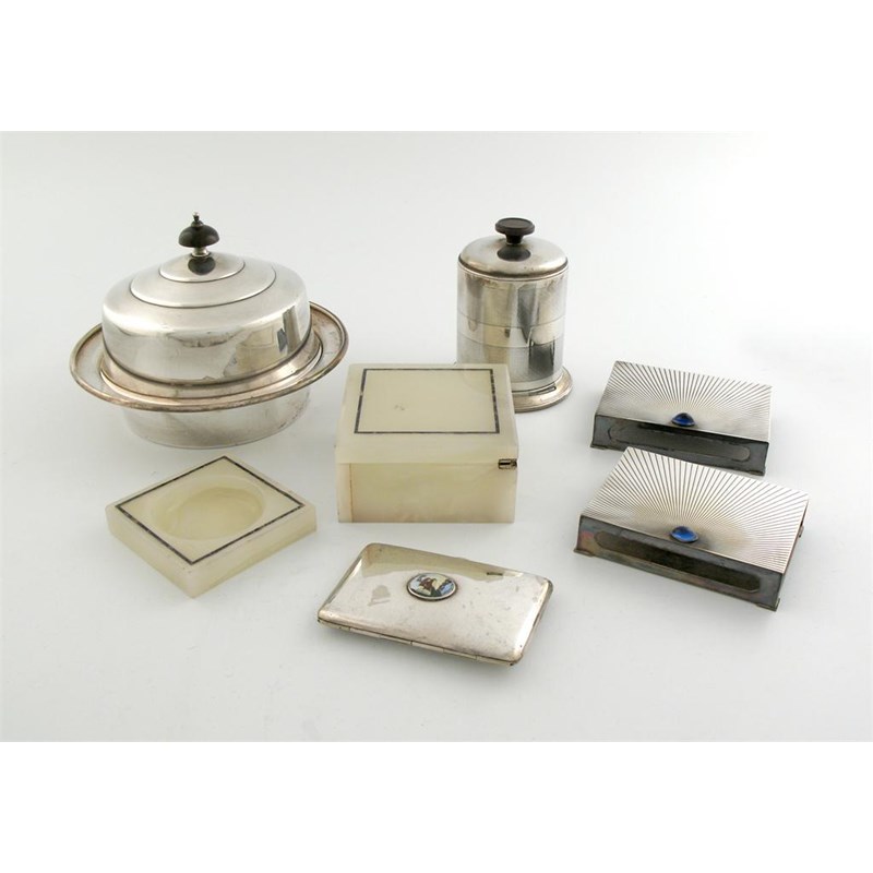 comprising a silver cigarette canister, the pull up dispensing cover with a bakelite finial, Birmingham 1931, a silver-gilt mounted oynx cigarette box and matching ashtray, plus two match box covers, by Christain Dior, the covers with a blue cabouchon and radiating decoration, an electroplated muffin dish, and an electroplated and enamel cigarette case. (7)
