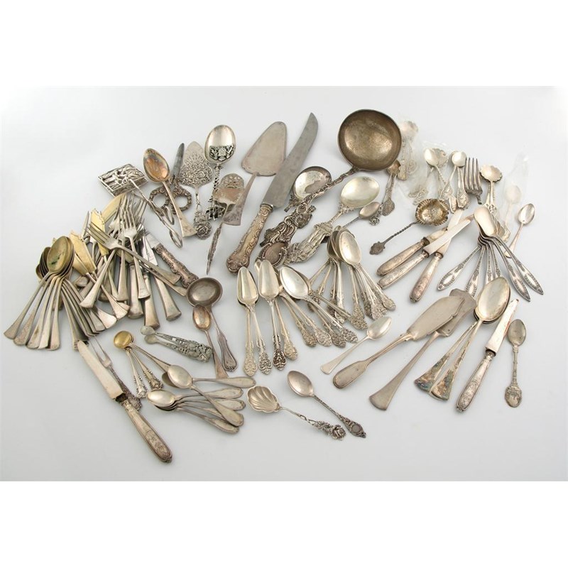 comprising: an American soup ladle, a carving knife, a pair of serving tongs, a set of six ice cream spades, a set of twelve teaspoons, a set of six grapefruit spoons, a butter knife, a slice, a spoon with a figural terminal, a collection of Austro-Hungarian flatware with tapering terminals, a Dutch spoon and other items, approx. weighable 70oz. (qty)