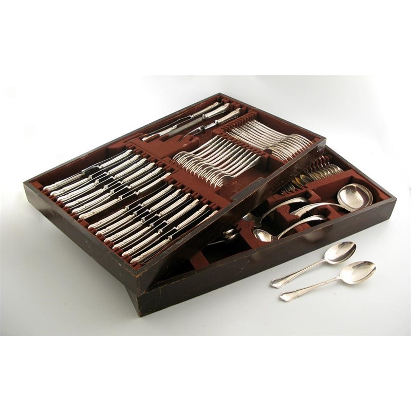 comprising: eleven table forks, twelve dessert forks, twelve table knives, twelve dessert knives, twelve dessert spoons, eight large soup spoons, four small soup spoons, eight tablespoons, twelve teaspoons, twelve coffee spoons, a soup ladle, and a pair of sauce ladles, in two fitted trays, approx. weighable 140oz. (qty)