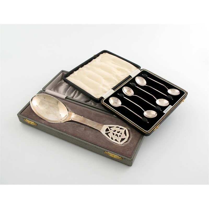 oval bowl, the terminal pierced with a foliate motif, in a fitted case, plus a cased set of six silver coffee bean end spoons. (2)
