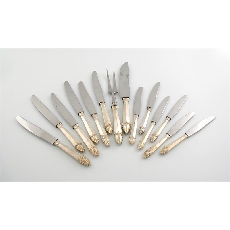 A set of six continental silver mounted table knives, six dessert knives and a carving knife and fork,