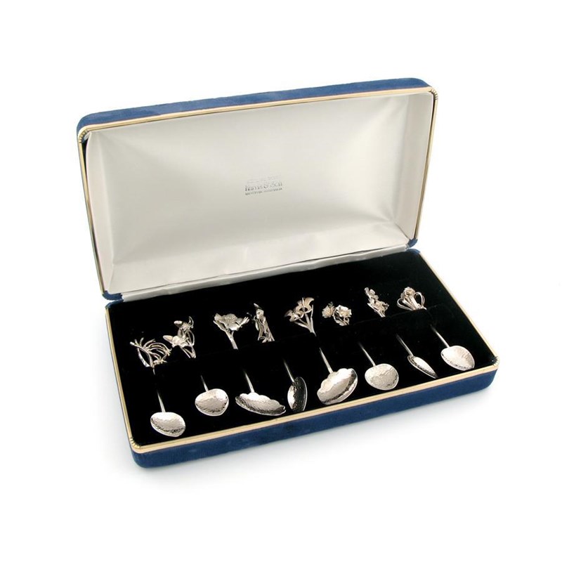 each with a different flower finial,m spot hammered bowls, in a fitted case.