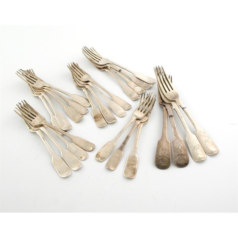 comprising: twenty dessert forks, and four table forks, some crested and initialled, approx. weight 36oz. (24)
