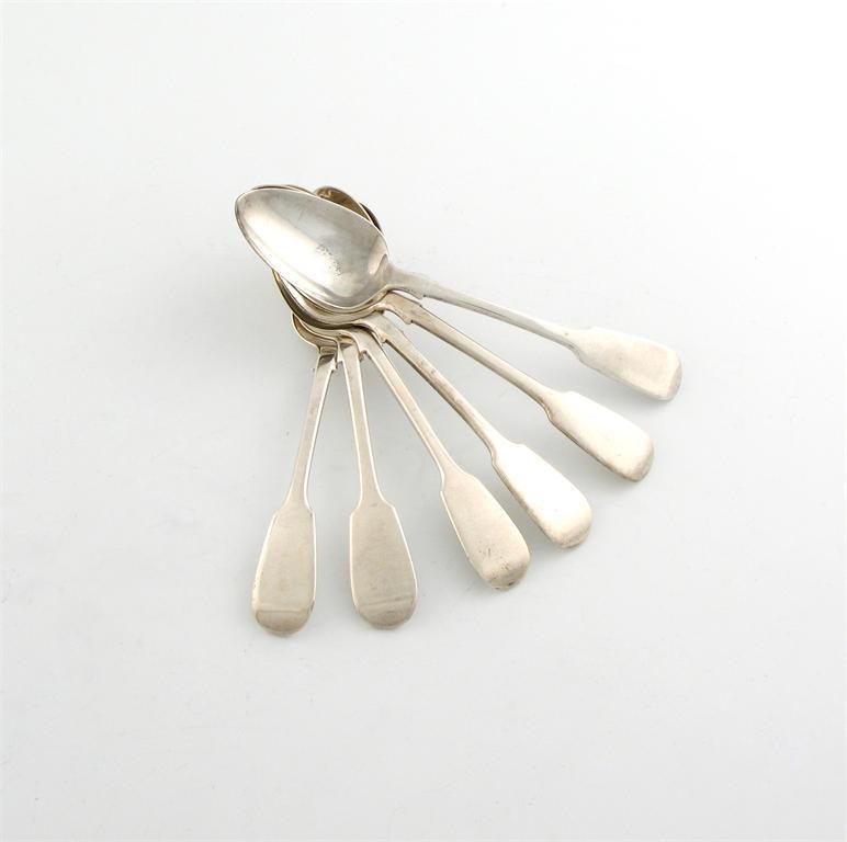 A set of six early Victorian silver Fiddle pattern dessert spoons