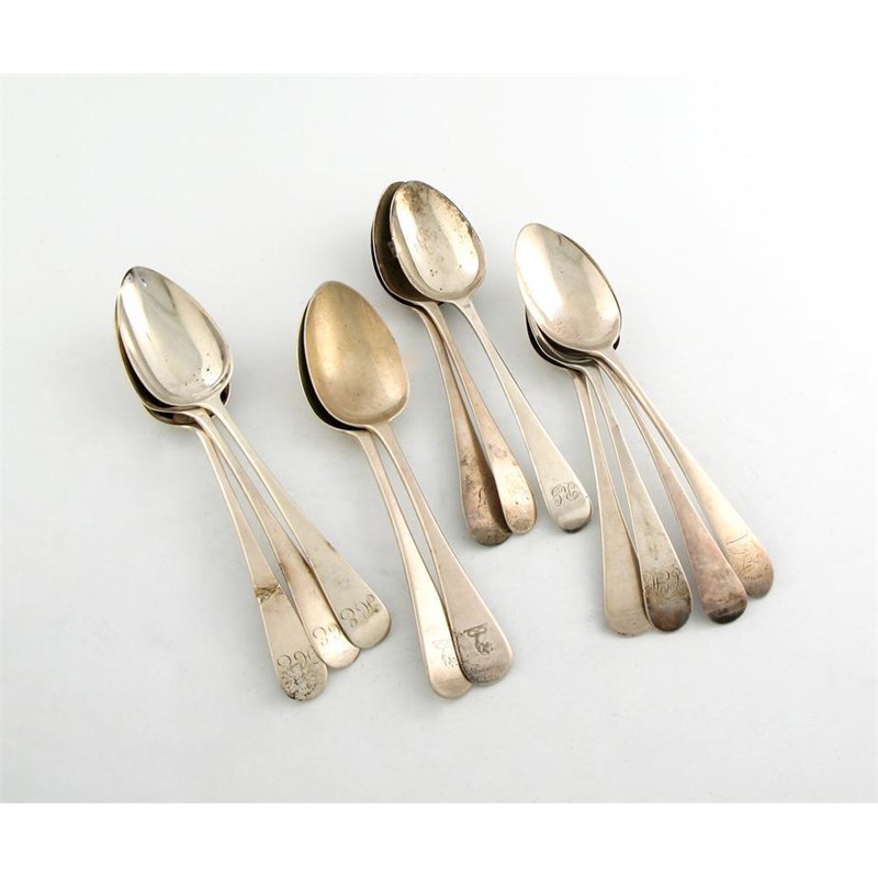 A collection of twelve antique silver Old English pattern tablespoons,