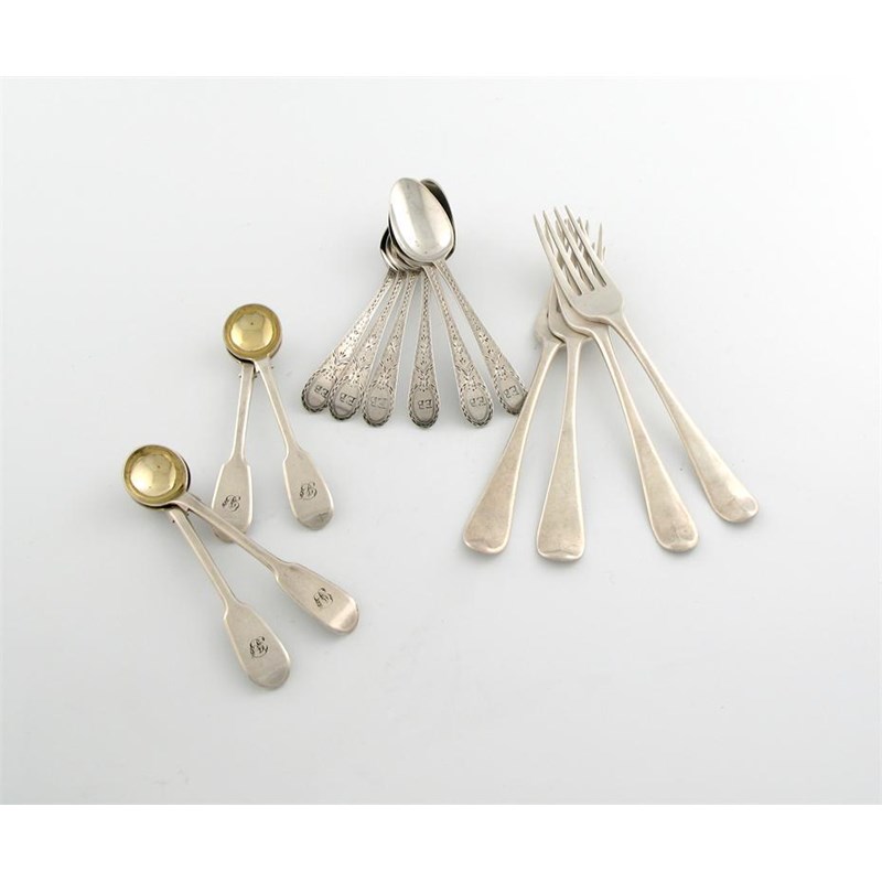 comprising: a set of six Bright-cut teaspoons, by Hester Bateman, London 1787, four George III old English pattern dessert forks, and a set of four Fiddle pattern salt spoons, London 1826, approx. weight 10oz. (14)