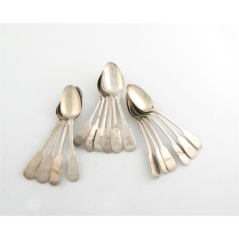 A collection of sixteen antique silver Fiddle pattern dessert spoons