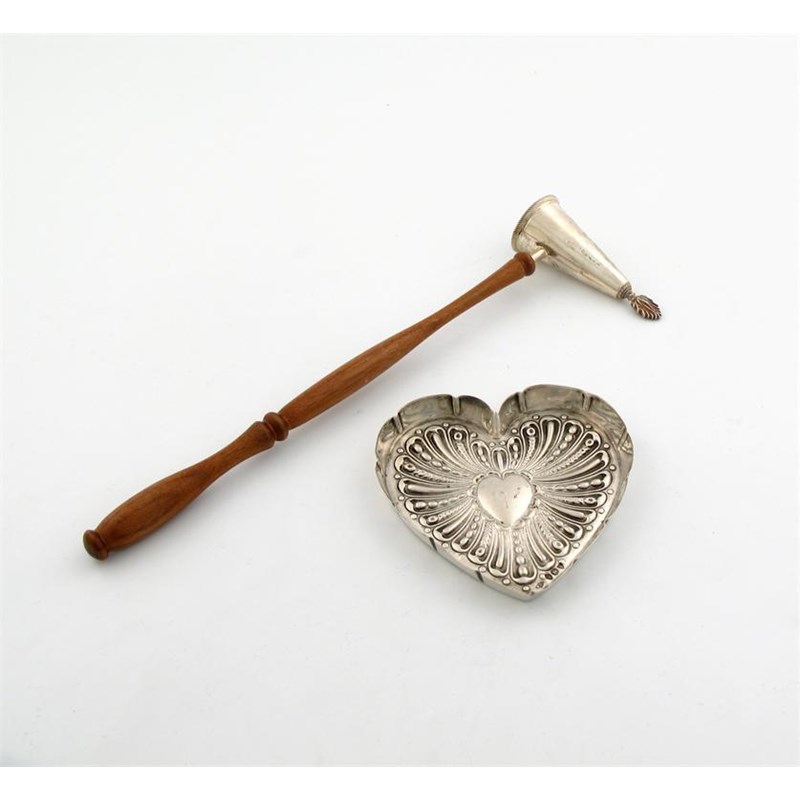conical form, wooden baluster handle, length 26.5cm, plus a silver pin tray of heart form, by William Comyns, London 1893. (2)