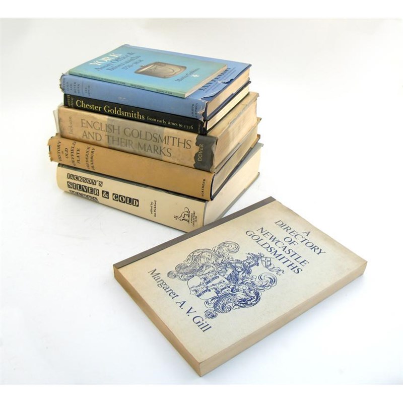 Seven various silver-related reference books; including Jackson's Silver and Gold Marks, edited by Ian Pickford, 1989; a second Jackson's Silver and Gold Marks, 1964; a Directory of Newcastle Goldsmiths, by Margaret A Gill, and four other various titles. (7).