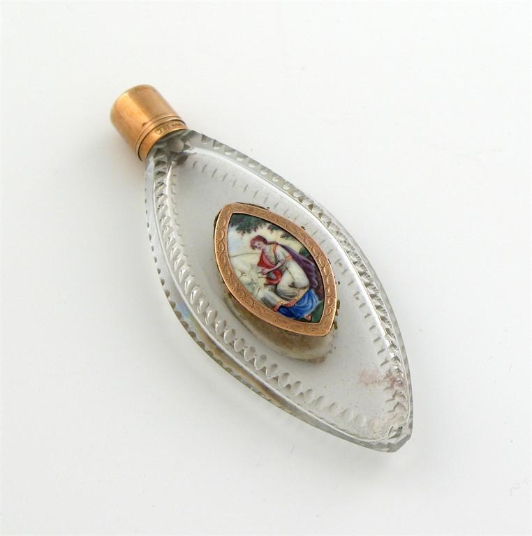 the plain later mount on an ovoid glass body with unassociated enamel plaques, length 10.5cm.