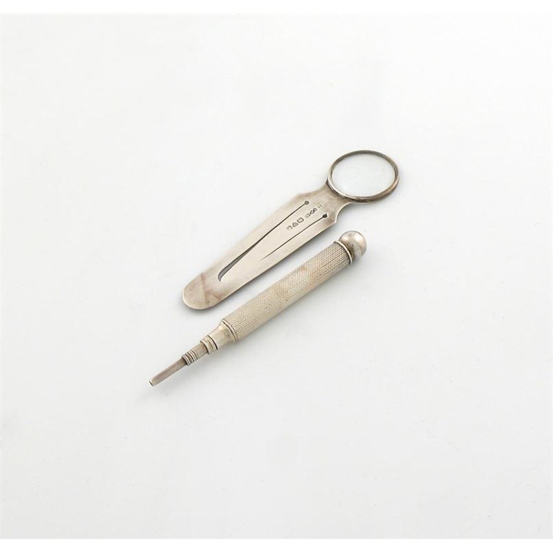 tapering form, the terminal with a circular magnifying glass, plus a propelling pencil. (2)