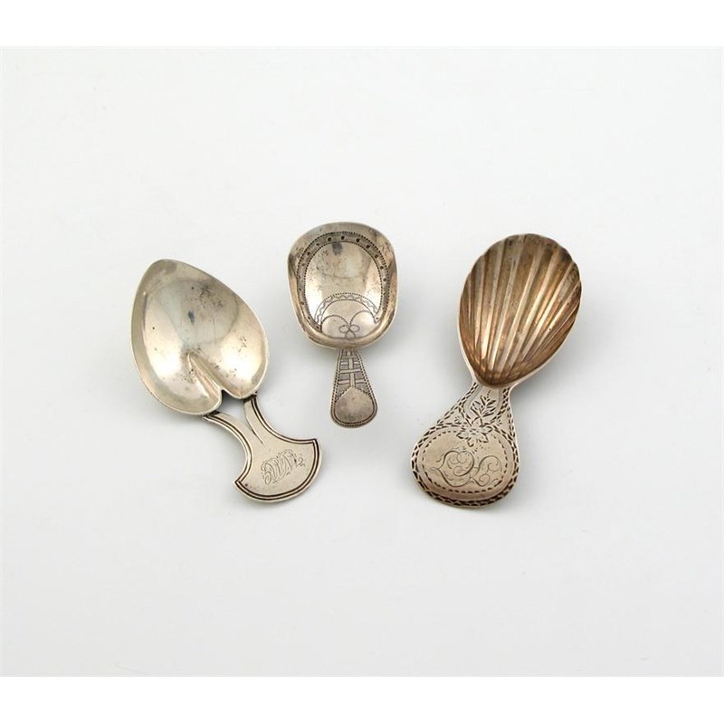 comprising: a George III silver spoon with a fluted bowl and wide bright-cut handle, monogrammed, length 8.2cm, plus one with a heart shaped bowl and reeded bifurcated handle, London 1807, and one with an engraved handle, by Joseph Taylor, Birmingham 1810. (3)