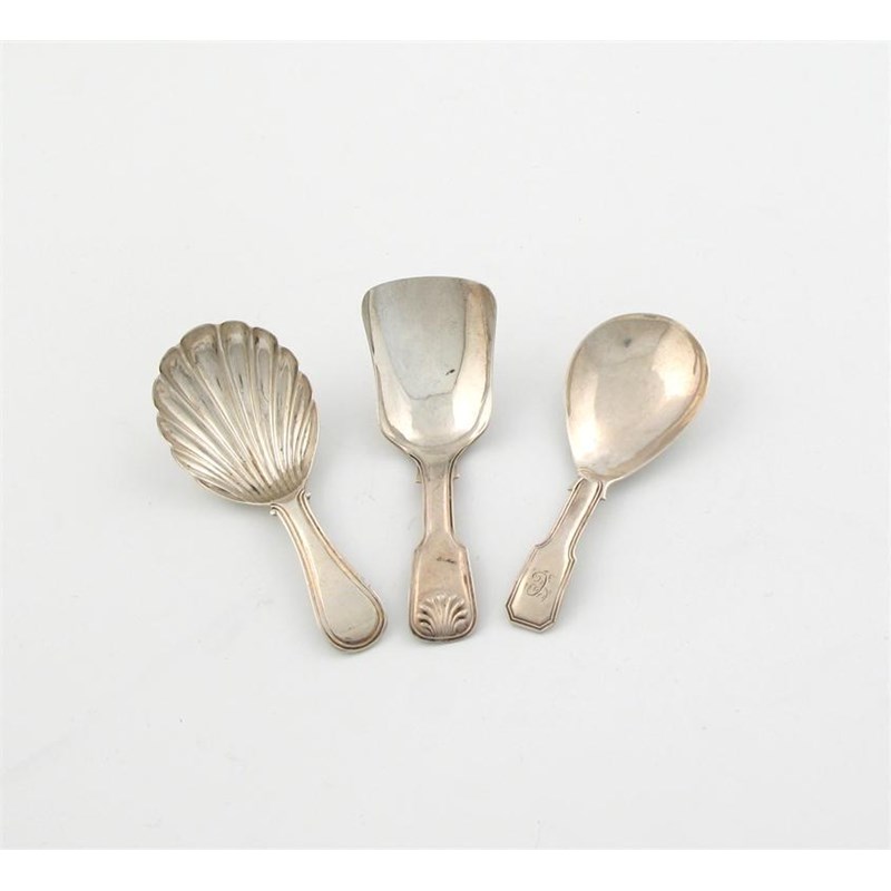 by George Unite, Birmingham 1834, plus a Fiddle and Thread pattern caddy spoon, Birmingham 1817, and a caddy spoon with a fluted bowl and thread handle. (3)