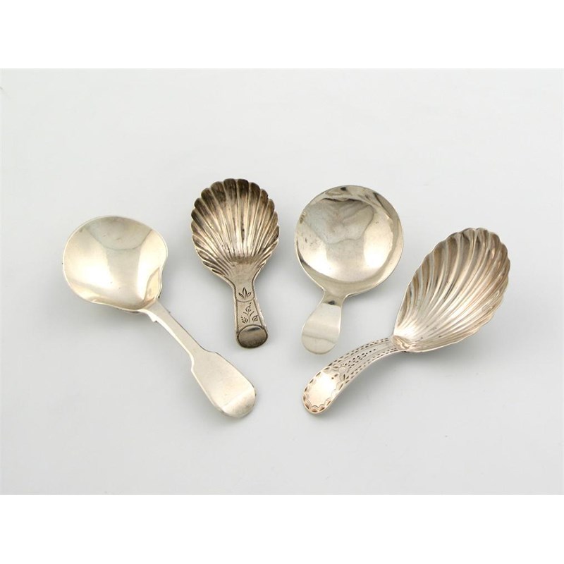 fluted bowl, bright-cut handle, length 8.2cm, plus another bright-cut example, and a Fiddle pattern caddy spoon and one with a short handle. (4)