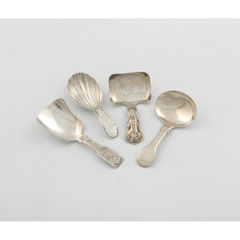 shovel bowl, the Fiddle handle with engraved decoration, length 9cm, plus three further silver caddy spoons. (4)