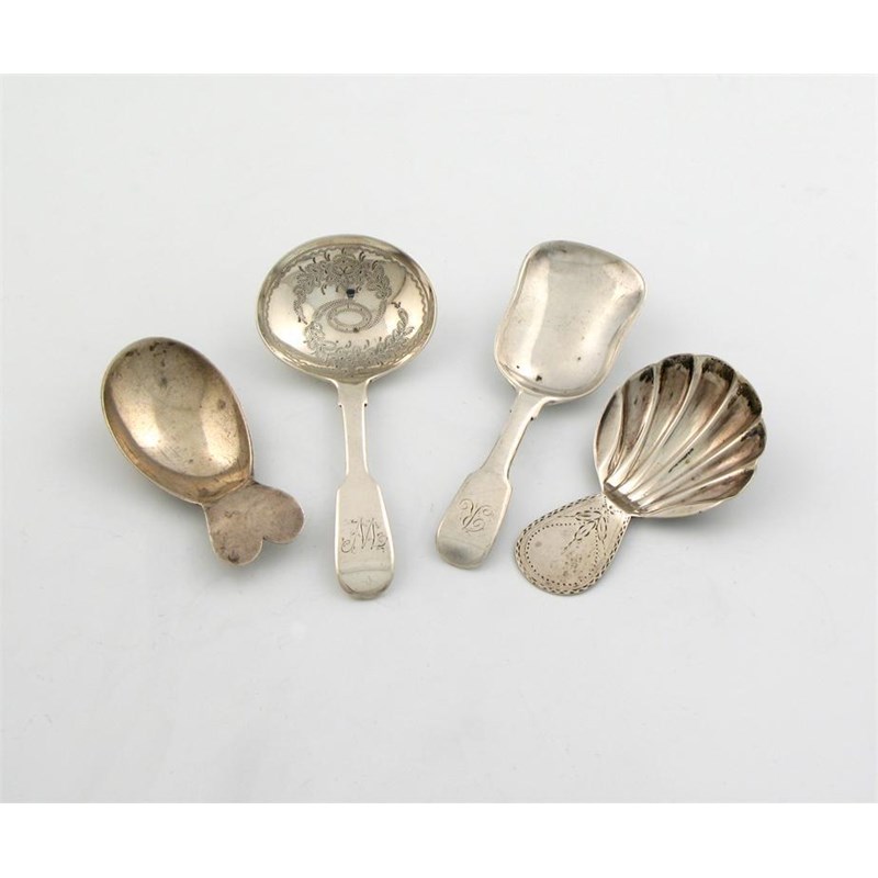 shell shaped bowl with a bright-cut handle, plus a Fiddle pattern caddy spoon with an engraved oval bowl, and two other caddy spoons. (4)