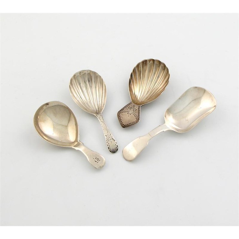 fluted bowl, bright cut handle, plus two Fiddle pattern caddy spoons and one with bright-cut decoration. (4)