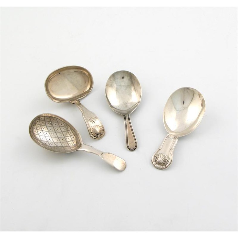the bowl engraved with lattice decoration, length 9.3cm, plus a Fiddle, Thread and Shell caddy spoon, unmarked, an Irish caddy spoon and one other. (4)