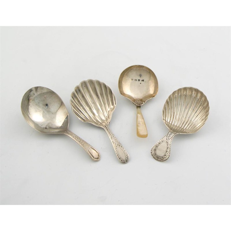 the bowl mounted with a vine leaf, mother-of-pearl handle, plus two caddy spoons with fluted bowls and bright-cut decoration, London 1795 and 1808, plus another caddy spoon. (4)