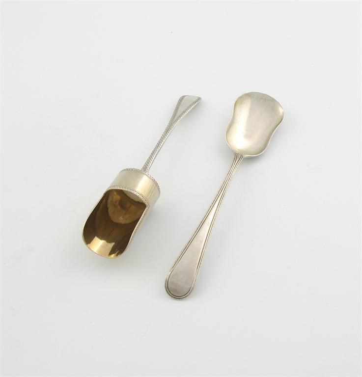 gilded bowl, bright cut borders, length 15cm, plus a silver sugar spoon, London 1789 by Smith and Fearn, slight feather-edge border, length 16.5cm. (2)