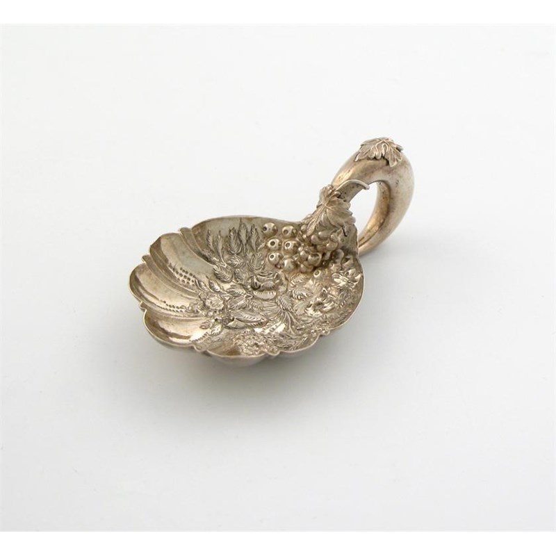 shaped oval bowl, embossed foliate decoration, leaf capped scroll handle, length 7.2cm.