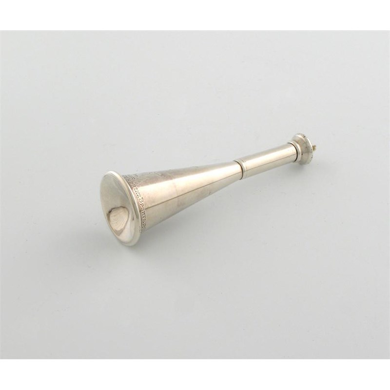 modelled as a hunting horn, crested and inscribed, height 11.8cm.