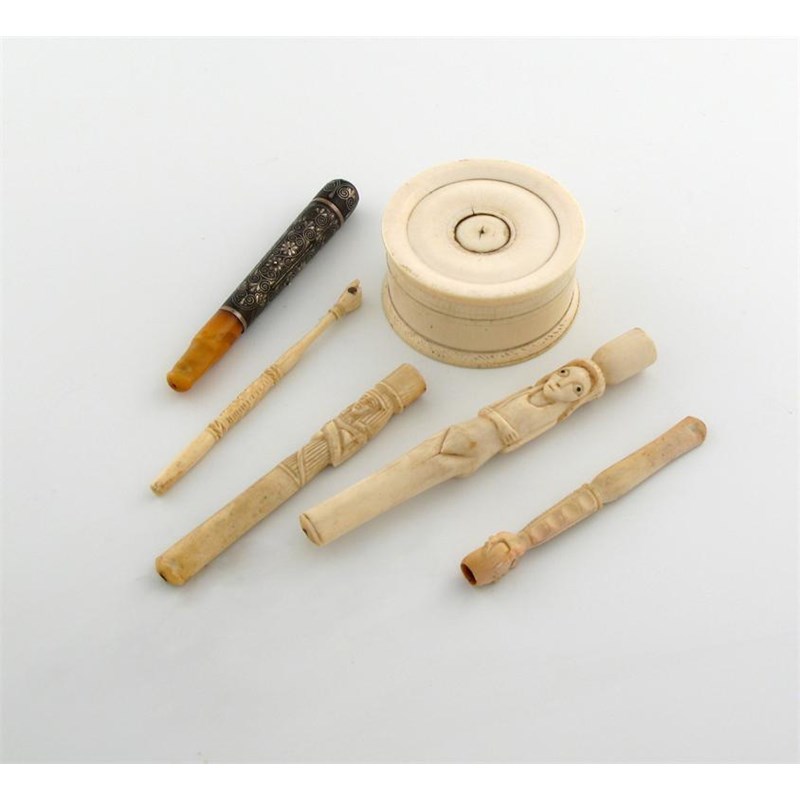 comprising: a box of circular form, central button, pull-off cover, three cigarette holders, an amber cigarette holder and a carved had with a spy glass with scenes of Paris. (6)