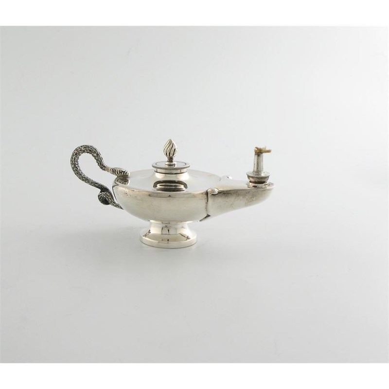 modelled as an oil lamp, snake scroll handle, the lighting rod with a flame finial, on a circular foot, length 13.4cm, approx. weight 4oz.