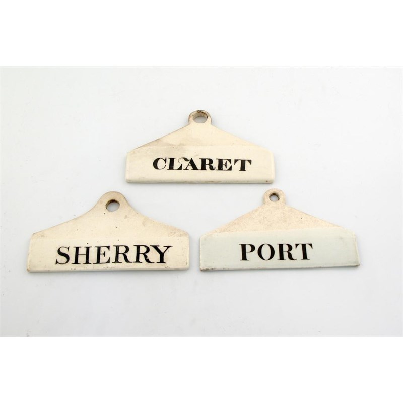 tapering rectangular form, plain ring terminal, titled, 'CLARET', 'SHERRY', and 'PORT' length 14.2cm. (3)