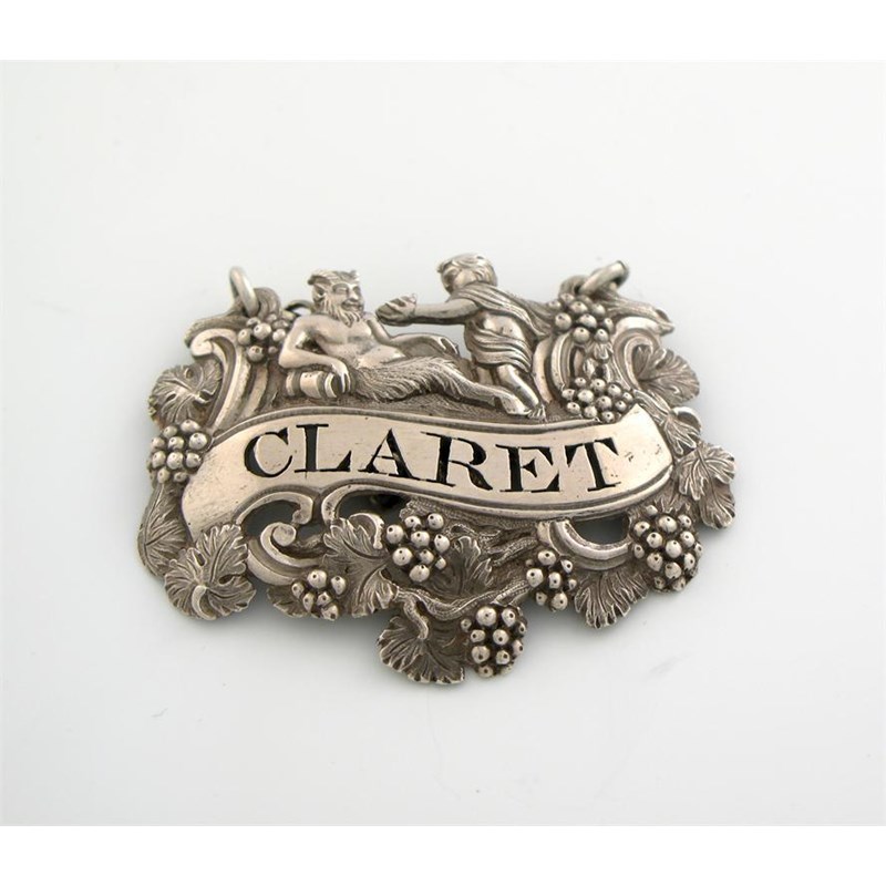shaped oval form, with Bacchus being handed wine by a cherub, surrounded by bunches of grapes, pierced 'CLARET', length 5.8cm.