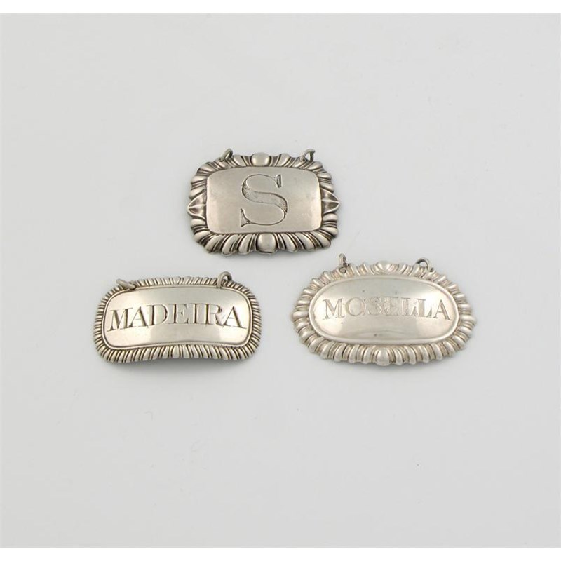 rectangular form, gadroon border, incised 'S', plus a wine label, re-titled 'Mosella' and a Maderia label, London 1805, approx. weight 1.3oz. (3)