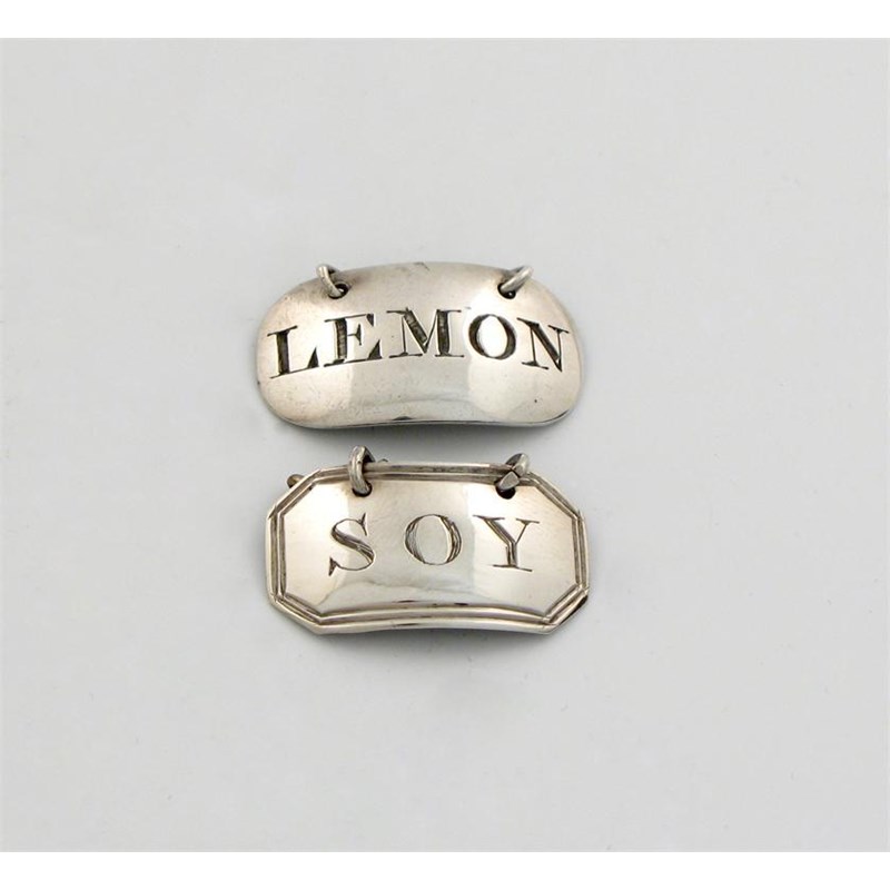 rounded rectangular form, incised 'LEMON', length 2.8cm, plus a George III silver sauce label of rectangular form, reeded border, incised 'SOY', by John Holloway, London 1797, length 2.7cm. (2)