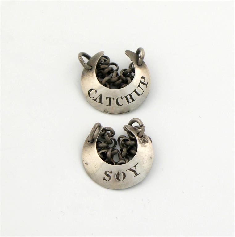 crescent form, incised 'CATCHUP' and 'SOY', length 2cm. (2)
