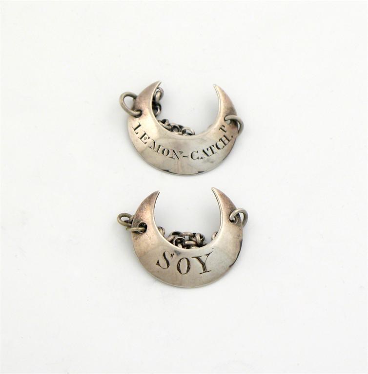 crescent form, incised 'SOY' and 'LEMON CATCHp', length 2.1cm. (2)