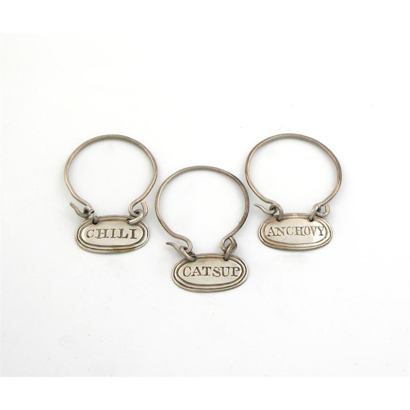 oblong form, reeded border, incised 'CATSUP', 'CHILI', 'ANCHOVY', the ring mounts detachable one side, length 2.5cm. (3)