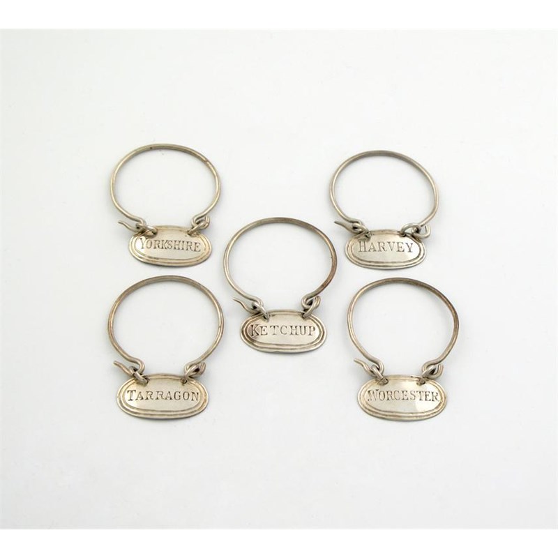 ensuite to the pevious lot, oblong form, reeded border, incised 'WORCESTER', 'KETCHUP', 'TARRAGON', 'YORKSHIRE' and 'HARVEY', the ring mounts detachable one side, length 2.5cm. (5)