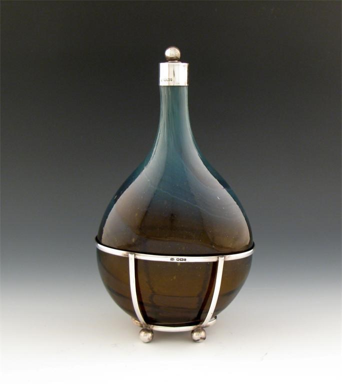 oval baluster form with graduating colours form milky blue to brown, plain silver mounts with a ball stopper, wirework frame, on four ball feet, approx. weight 3oz., height 17.5cm.