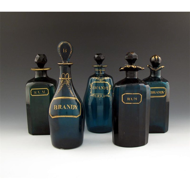 comprising three of faceted form, gilt highlights and titled 'RUM', x2, and 'BRANDY', plus two of mallet form, both titled 'BRANDY', one with a tear drop shaped stopper initialled 'B', height 23.3cm. (5)