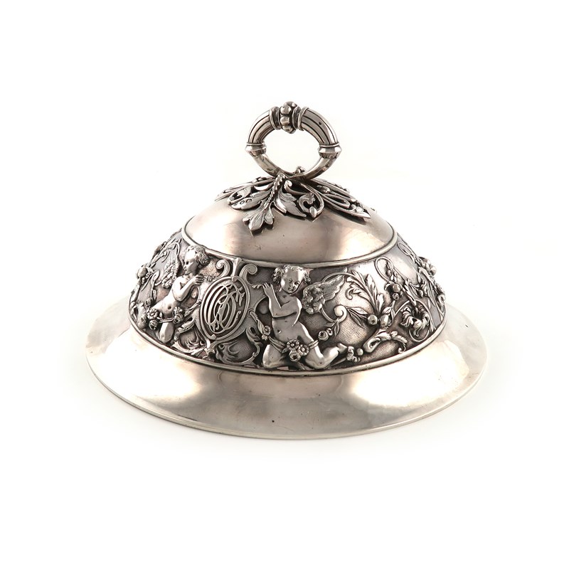 domed circular form, with a central band of two putti holding crested armorial shields, applied with a monogram, on a matted background, central scroll handle with pierced foliate scroll mounts, diameter 24.8cm, approx. weight 31.5oz.