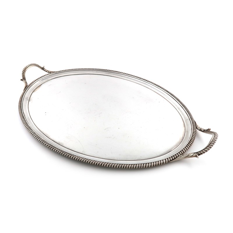 oval form, leaf capped gadroon handles and borders, length handle to handle 58.5cm, approx. weight 82oz.