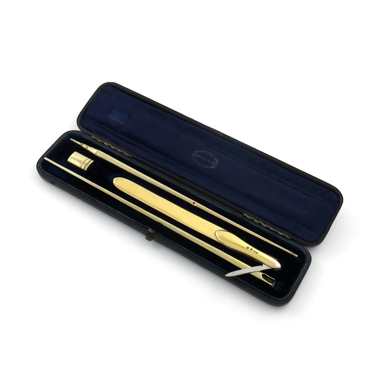 plain form, comprising: a pencil, a dip pen, a lead holder and a letter knife, the handle with a hinged penknife, in a fitted case, length of letter knife 16.3cm, approx. weighable 2oz.
