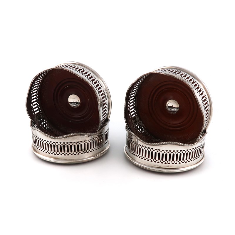 circular form, pierced with vertical slats, wavy-edge gadroon borders, turned wooden bases, diameter 13.5cm. (4)